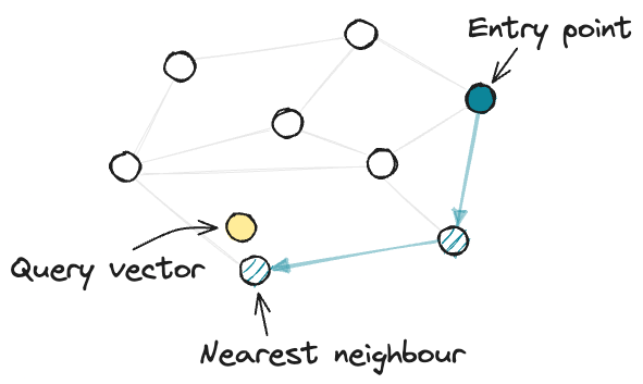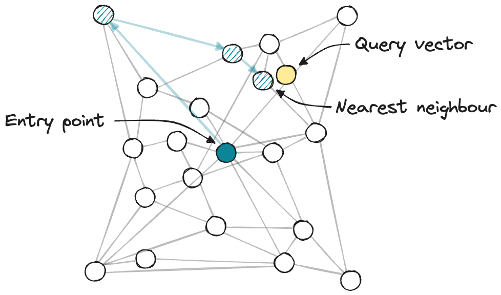 您的数据所在的向量空间也可以被视为一个可导航的小世界(NSW)图,其中节点表示数据点,边表示相似性,即描述两个节点在向量空间中的接近程度的数值。NSW通过构建一个无向图来确保全局连通性,即给定任意入口点,可以到达图中的任何节点。首先形成远距离的边(连接远离的节点,需要多次遍历),然后形成短距离的边(连接附近的节点)。长边提高了搜索效率,而短边提高了搜索准确性。可以通过遍历这个图来找到给定查询向量的最近节点。
