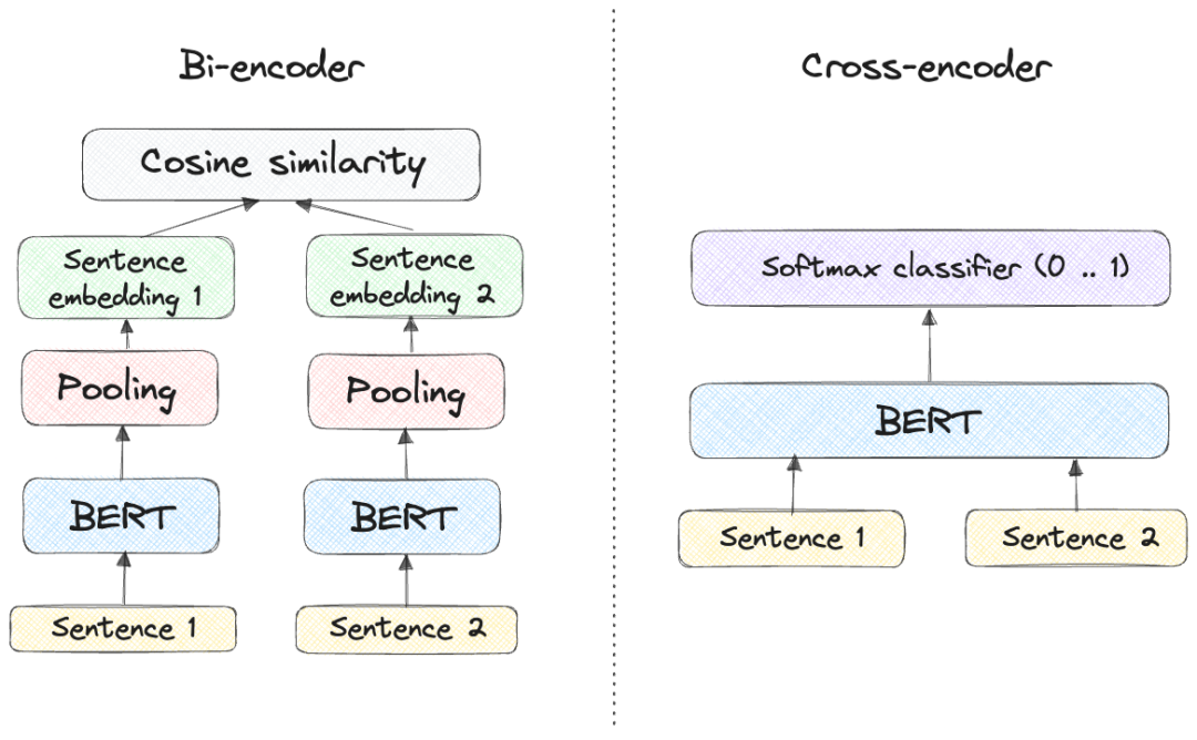 BM25是某些数据库(如Elasticsearch、Opensearch、MongoDB)中用于关键字搜索的最常见的索引算法。它通过考虑关键字词频与其逆文档频率(IDF)的关系来生成稀疏向量。相比之下,向量数据库通常使用稠密向量来编码和存储文本嵌入(与BM25不同,向量中的所有术语都不为零),通常通过类似BERT的双编码器模型来实现,该模型为一对文档生成一个句子嵌入,然后可以进行比较以生成余弦相似度分数。理解双编码器和交叉编码器之间的区别