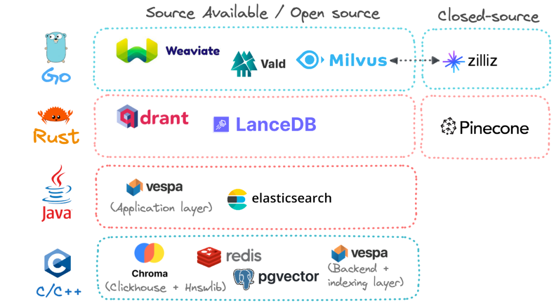 如今,快速、响应迅捷且可扩展的数据库通常使用现代语言如Golang或Rust编写。在专为向量数据库而构建的供应商中,唯一使用Java构建的是Vespa。Chroma目前是一个Python/TypeScript包装器,基于C++构建的OLAP数据库Clickhouse和开源向量索引HNSWLib。
