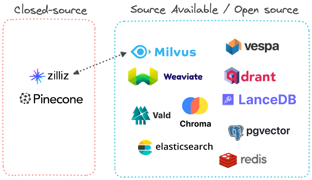 在列出的所有选项中,只有一个是完全闭源的:Pinecone。Zilliz也是一个闭源的完全托管的商业解决方案,但它完全建立在Milvus之上,可以看作是Milvus的母公司。其他所有选项至少在代码库方面是源代码可用的,具体的许可证决定了代码的可许可性以及如何部署。