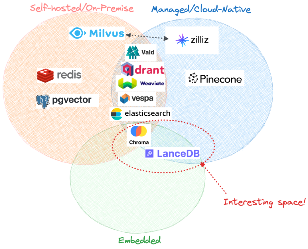 数据库供应商提供的典型托管方法包括自托管(本地部署)和托管/云原生,两者都遵循客户端-服务器架构。第三种较新的选择是嵌入式模式,其中数据库本身与应用程序代码紧密耦合,以无服务器的方式运行。目前,只有Chroma和LanceDB可用作嵌入式数据库。