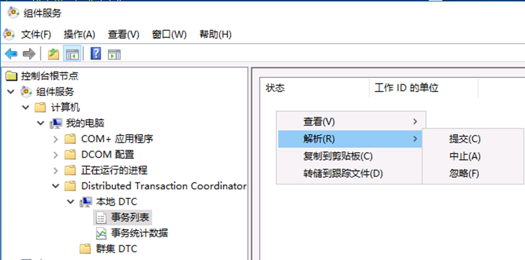 in-doubt xact resolution默认为0,如果集群使用本地MSDTC,并且使用分布式事务时主节点宕机,备节点数据库将出现可疑状态无法恢复。这时候必须强制事务提交或中止以释放锁才能使数据库资源可用。运行命令“dcomcnfg”或者 “comexp.msc” 打开“服务组件” —> 计算机 —> 我的电脑 —> 分布式事务协调器—> 本地DTC/集群 DTC —> 事务列表 —> 右键要处理的事务 —> 解析 —> 提交/中止/忽略。