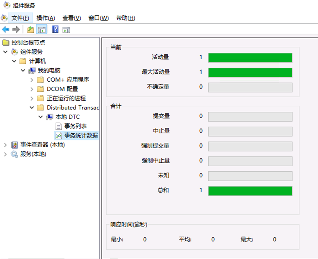 这里我打开一个分布式事务,当并未提交或回滚。在组件服务中,我们可用查看事务相关统计