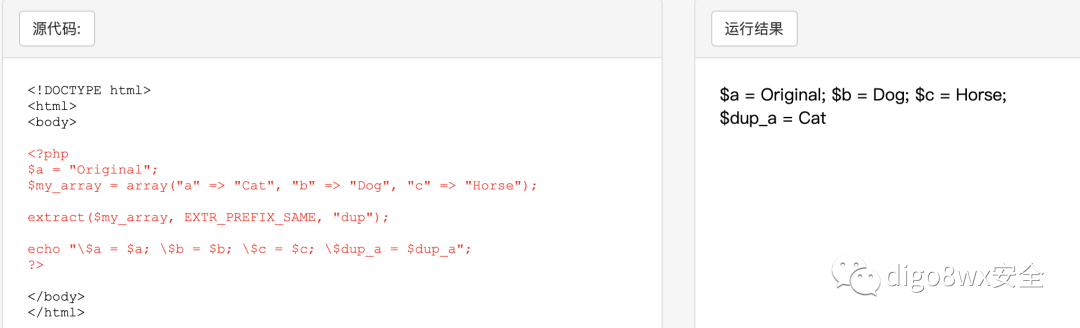 extract(array,extract_rules,prefix),其中array为必填字段,为规定要使用的一个数组,extract函数示例如下图所示: