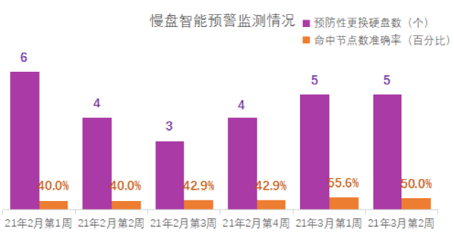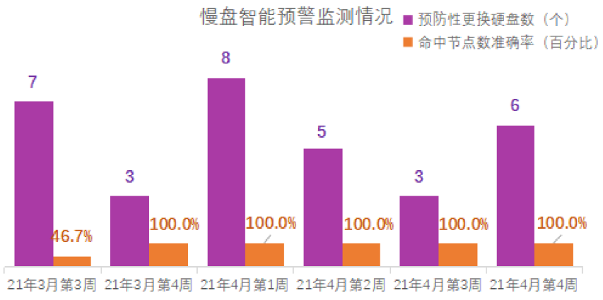 为改变被动的局面,我们进行了新的尝试,根据长期的任务跟踪,开发了慢盘智能预警模块, 通过特征提取,预警指标加入集群运行状态、批量任务执行时间、单个任务执行状态等。模块上线后,验证发现在应用效果中,单纯依靠任务指标,监测过程存在两种情况,一种是滞后性,一种是超期置前性。滞后性,即当慢盘产生时,基本能够准确定位到慢盘位置,但是预警性不足,我们需要的是在慢盘影响业务前提前将其下线或更换;而超期置前性,即我们通过历史预警结果发现,几天前、甚至是数周前预警到的部分硬盘,在几天后、数周后发生了慢盘故障,然而这种超预期的提前发现,不仅提前量较大,且存在随机性和误判,同样无法满足预防性更换。