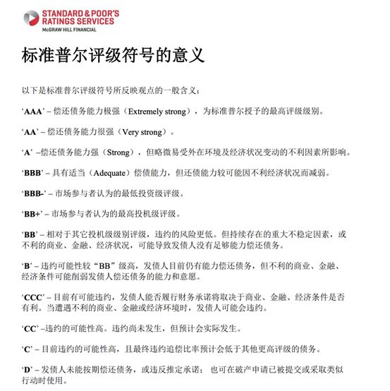 首先,我们需要理解评级的含义,例如上文的AAA、AA+、AA-代表了什么?直观的理解肯定是AAA最好,但更为专业的解释是什么呢?我们引用标准普尔来作更为专业的解释: