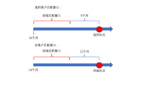 财务报表匹配上一个有意思的问题是时间匹配。例如用户在2019年12月31日违约,那财报我们应该选择哪个时间点的呢?太近太远都会失去建模的意义,通常业内的做法是好用户匹配12个月以前24个月以内能匹配到的最近财报,违约用户则匹配违约时间前,6个月以前18个月以内能匹配到的最近财报。如下图所示: