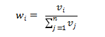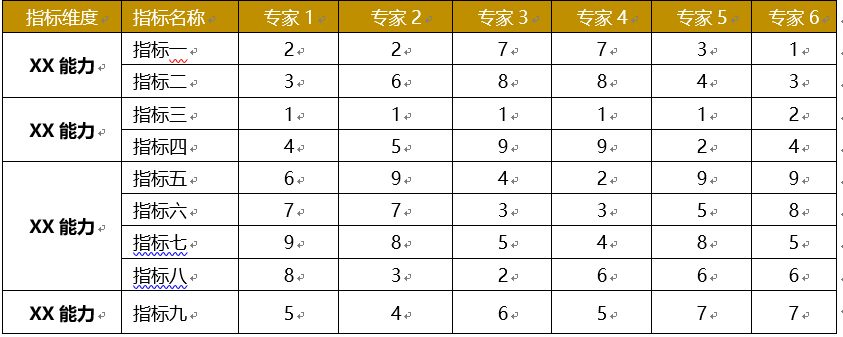 其中1-9代表重要性越来越低,通过专家们的选择,我们有了一张各专家判断的指标优先级,可以看出指标三是非常受到专家们的认可的。那么我们如何综合这些专家的意见呢?首先要得到每一个专家每一个指标的权重,然后再求得所有专家的每一个指标的平均权重。