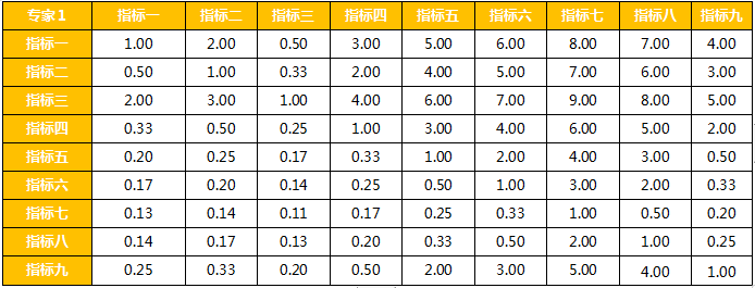 上面需要注意的一点是相同重要性间隔相等分数以外,也要保持指标重要性的对称性。例如,a1相较a2为2,那么a2相较a1则为0.5(1 / 2)。以此类推,可以生成所有专家的判断矩阵。