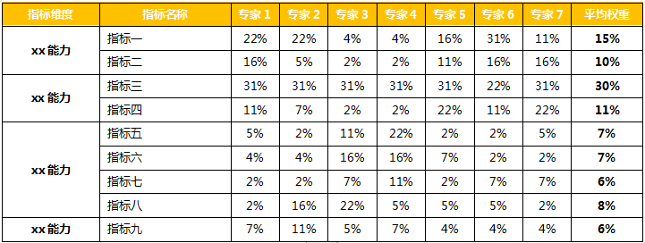 4. 同样的方法计算全部专家,并对所有专家的权重进行算数平均后可以得到如下表格: