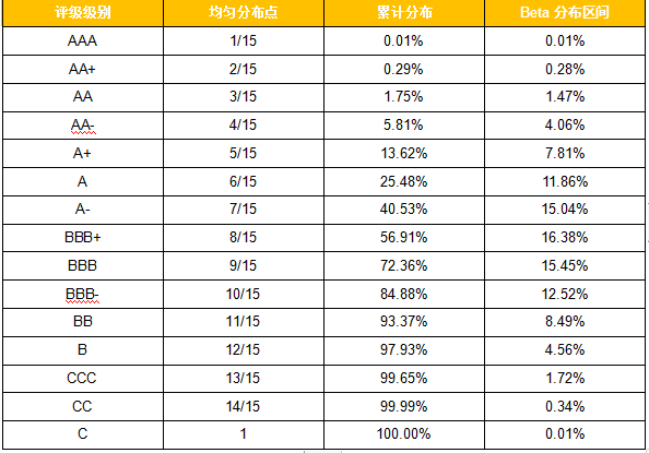 比较粗放的方式,我们可以直接拉出所有企业分数排序,然后根据你最终要的评级等级数量(AAA、BB、CC等级数量)进行均分,依次从高到低给予一定评级。但这种均匀分割存在一定弊端,例如AAA级和AA+级的间隔就和BBB和BB+级的间隔相同,这显然是不符合常识的。理论上来说,特别好的客户是相对较少的,特别坏的客户也是相对较少的,大量客户应集中在中部。我们自然的想到我们需要的评级区间的分布,Beta分布正好合适。