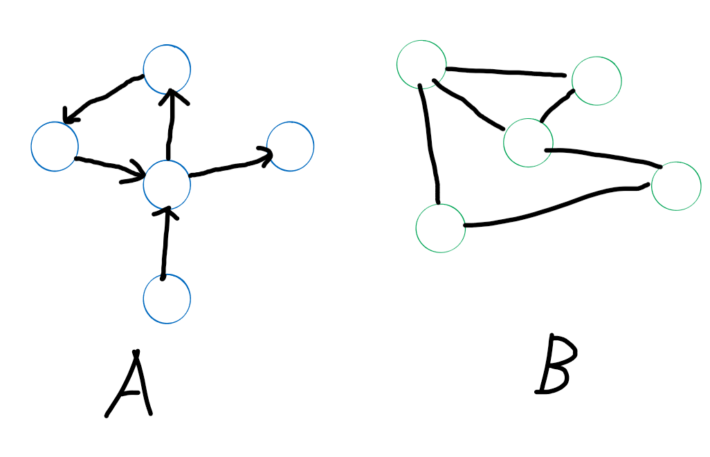 图是一堆相互连接的节点的集合,其中每个节点被称作顶点(Vertex),连接顶点之间的连线叫做边(Eage)。图定义为一种由一系列有限的顶点和边组成的数据结构。图可以分为有向图(directed)和无向图(undirected)两种结构,如下图中的A和B。