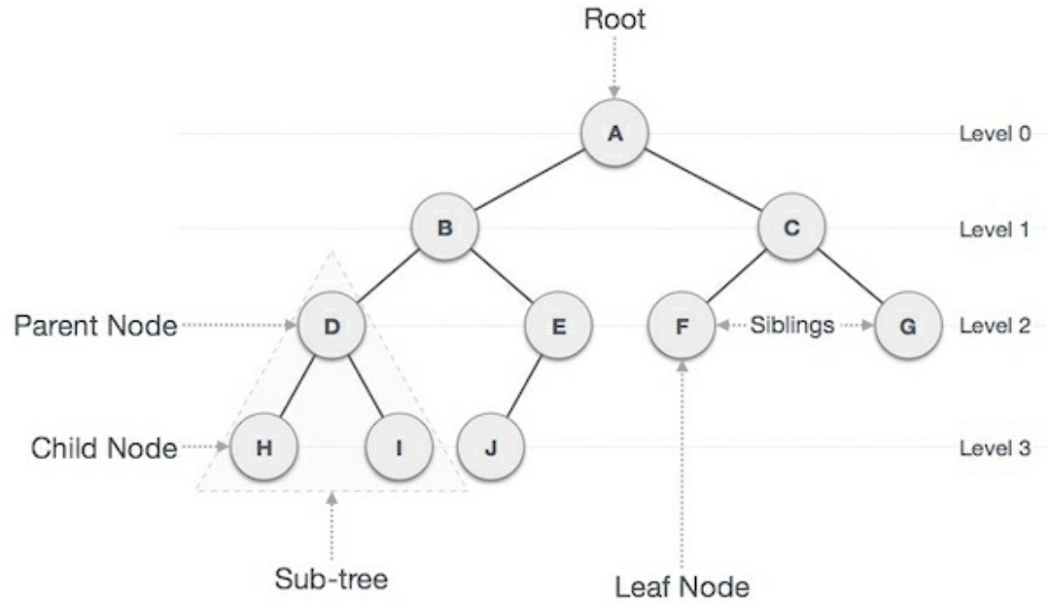 二叉树是一种典型的分层结构,它由相互连接的节点组成,之所以叫做二叉树,是因为每个节点最多只能有两个子节点。最上面的节点叫做根节点(Root),对于每一个给定的节点,与它直接相连且在它之下的节点被称之为子节点(children),在它之上的称之为父节点(parent)。父节点和子节点一起被称作子树,如果一个节点没有子节点,则称之为叶子节点。从根节点到叶子节点的最大节点数称之为二叉树的高度。下图详细展示了这些概念。