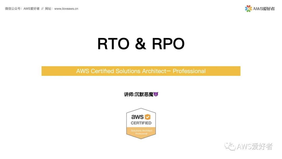 组织通常根据当业务不可用时对业务的财务影响来定义可接受的RTO和RPO,然后技术部门在根据RTO、RPO的要求设计灾难恢复方案,在规划时同时要考虑方案的实现成本。可用性越高,RTO、RPO的值越低,可能实现成本就越高。规划RTO,RPO时应在与实现成本之间找到平衡点。好的,以上就是我们今天的视频课程内容,RTO和RPO的内容非常的重要,在考试中,会出现如,要达到题干给定的RTO或RPO需要采取何种技术方案等类似的题目,希望今天的课程能给大家带来帮助。希望此系列教程能为您通过 AWS解决方案架构师认证 Professional 认证考试带来帮助,如您有任何疑问,请联系我们:* AWS爱好者的网址是www.iloveaws.cn。* 可以通过扫码加入【AWS爱好者】微信公众号,查看原创的AWS知识点相关文章* 加入【AWS爱好者】微信群,和其他同学一起备考,以及探讨交流AWS相关知识我们今天的视频课程就到这里,感谢大家的观看,我们下一课程再见。