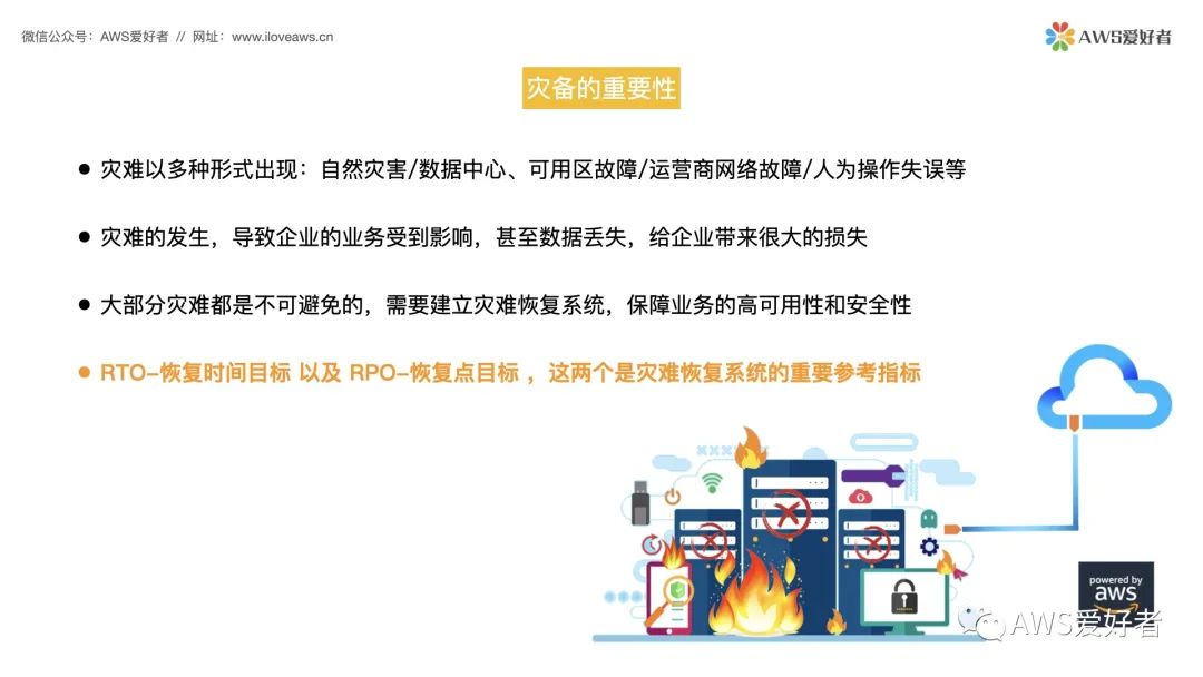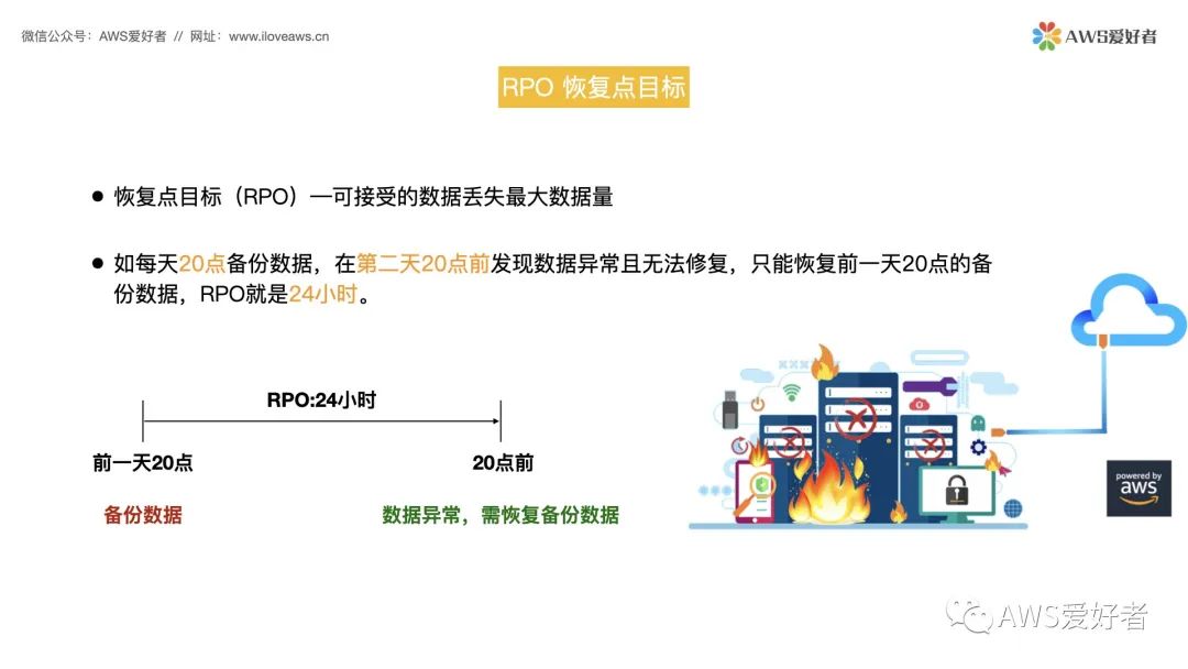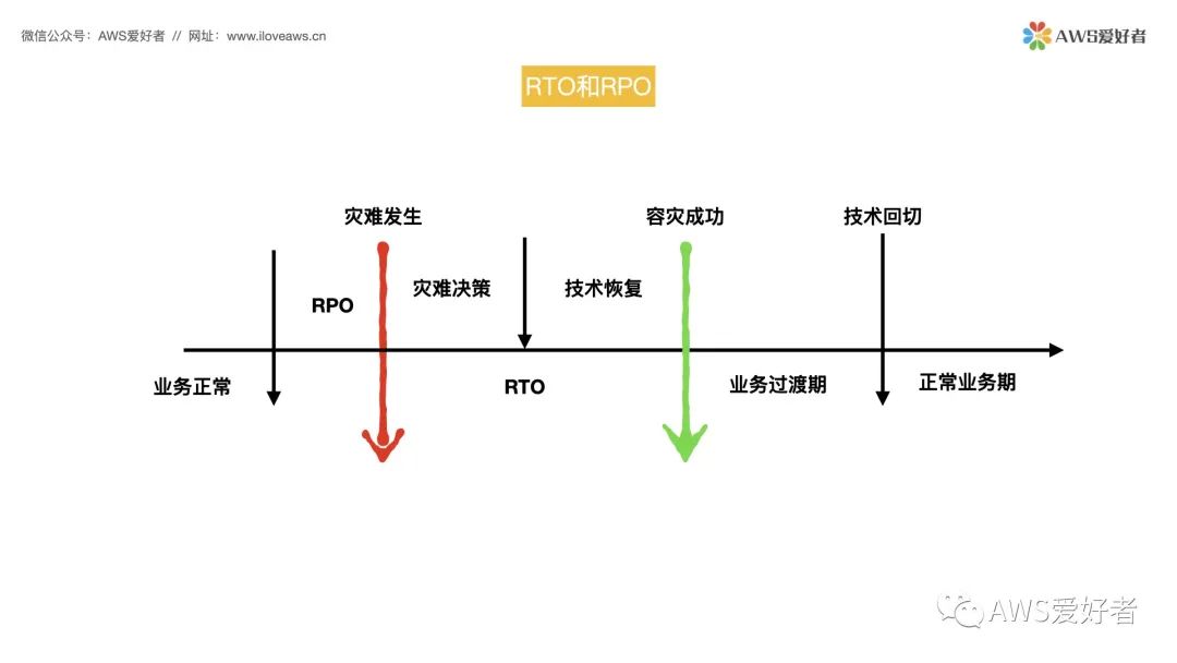 Hello大家好,欢迎来到《AWS解决方案架构师认证 Professional(SAP)中文视频培训课程》,我们今天的视频课程内容 RTO和RPO。RTO,恢复时间目标 以及 RPO,恢复点目标 ,这两个是灾难恢复系统的重要参考指标,也是在您设计基于高可用架构的重要参考指标。如今,灾难以多种形式出现,自然灾害、数据中心/可用区故障、运营商网络故障、人为操作失误等等都可能会导致企业的业务受到影响,甚至数据丢失,给企业带来很大的损失,所以灾备的重要性毋庸置疑。如今企业的IT应用环境几乎都运行在数据中心/云中,数据中心/云的业务架构越来越复杂,业务数据也越来越重要,这个时候灾备也就也来越重要。在去年也出现了多起公有云因光缆被挖断,人为操作失误导致的故障,影响了使用这些公有云的企业对外提供的业务,造成了严重的损失。天灾和人祸是不可避免的,所以需要建立数据中心/云的灾难恢复系统,来保证业务的高可用性和安全性。建立灾难恢复系统的目的,是为了在灾难发生后能够最快速的恢复业务和数据,保证企业业务的持续稳定运行。在数据中心/云灾难恢复系统中,最常见的指标就是恢复时间目标(RTO)和恢复点目标(RPO)。