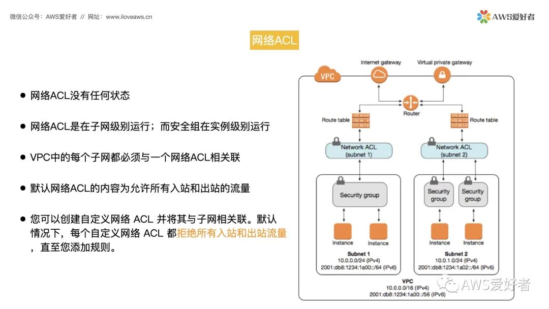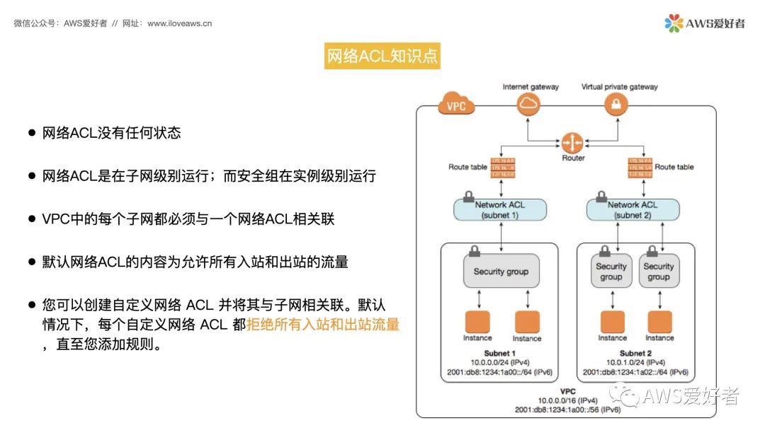Hello大家好,欢迎来到《AWS解决方案架构师认证 Professional(SAP)中文视频培训课程》,我们今天的视频课程内容为网络ACL。网络访问控制列表 (ACL) 是 VPC 的一个可选安全层,可用作防火墙来控制进出一个或多个子网的流量。我们开始今天的课程内容,我们来看下网络ACL的一些重要知识点。1、网络ACL是无状态的,这意味着允许入站流量的响应,返回的数据流必须被出站规则明确允许(反之亦然)。2、网络ACL是在子网级别运行;而安全组在实例级别运行。我们看下PPT右侧的图:子网1中有一台EC2,安全组是与这台EC2的网络接口关联的,因此安全组是在实例级别运行的。然而,对于网络ACL,它不是在实例级别运行,而是在子网级别运行。我们看下图,子网1关联了一个网络ACL,这个子网1中可能有数百台EC2实例,那么对于这个网络ACL规则的调整,是会影响关联的子网1中的所有EC2实例的。假设来自互联网网关的数据流会使用路由表中的路由,路由到合适的子网,与子网关联的网络 ACL 规则控制允许进入子网的数据流,与实例关联的安全组规则控制允许进入实例的数据流。3、VPC中的每个子网都必须与一个网络ACL相关联。如果您没有明确地将子网与网络ACL相关联,则子网将自动与默认网络ACL关联。4、(上面提到了默认网络ACL)默认网络ACL的内容为允许所有入站和出站的流量, 也就是允许所有流量流进和流出与其关联的子网。所以,当我们在子网启动实例后,如果使用的是默认网络ACL,那么至少网络ACL对于启动的实例是放行的。5、您也可以创建自定义网络 ACL 并将其与子网相关联。默认情况下,每个自定义网络 ACL 都拒绝所有入站和出站流量,直至您添加规则。所以如果您自己创建了自定义网络ACL,要注意默认情况下会拒绝所有出入站流量,需要根据实际需求自行调整规则,这一点也是容易忽视的地方。