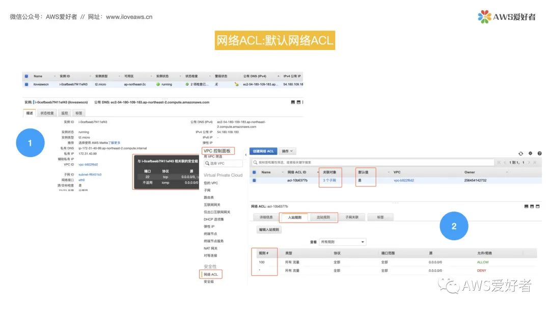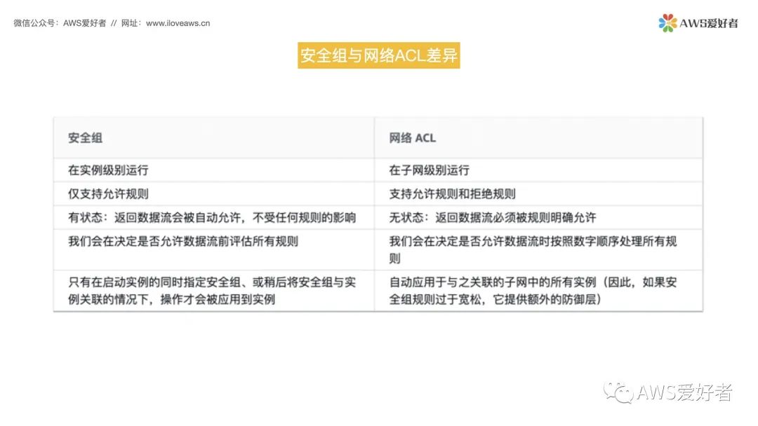 我们接下来看下安全组和网络ACL的差异,这也是很多同学可能比较关心的部分。1、安全组在实例级别运行,网络ACL在子网级别运行。2、安全组仅支持配置允许规则,在安全组无法配置拒绝规则。例如配置显式拒绝某个IP地址访问EC2实例,这个安全组做不到;而网络ACL支持允许规则和拒绝规则。我举个例子,比如我们有一台EC2,对外开放了80端口的访问,如果想要拒绝某个来源IP对实例的80端口访问,这个通过安全组是做不到的,需要使用网络ACL添加相应的拒绝规则。3、安全组是有状态的,返回的数据流会被自动允许;而网络ACL是无状态的,返回数据流必须被规则明确允许,就是说使用网络ACL配置了允许进站的规则必须要有相应允许出站的规则。4、规则判断的区别,安全组会在决定是否允许数据流前评估所有规则;网络ACL会按照规则的数字,顺序处理所有规则,这块我们后面会进行演示。5、安全组只有在与实例关联的情况下,规则才会被应用到实例;而网络ACL自动应用于与之关联的子网的所有实例,网络ACL提供了额外的防御层。