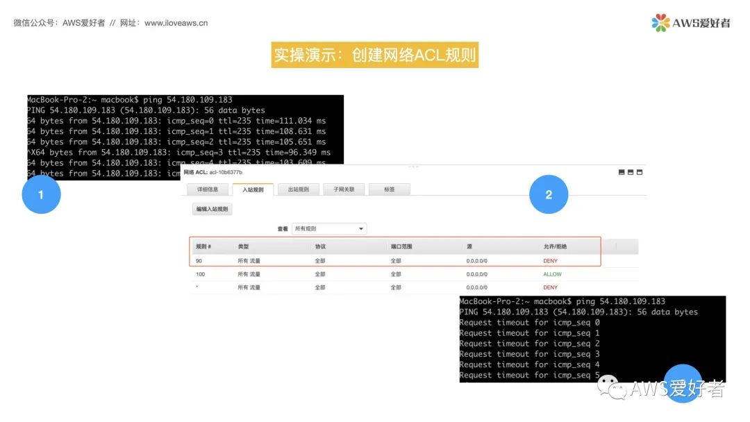 我们切换到EC2控制台页面,复制这台EC2的外网IP,然后在切换到我本地的终端,使用PING命令来测试下:可以看到返回的信息显示可以PING通的,我本地电脑是可以和这台EC2通信的。接下来我们做个测试,修改下这台EC2所在子网关联的网络ACL的入站规则,我们添加一个入站规则:添加规则,编号输入90 ,然后选择所有流量,协议,端口范围以及源都保持和编号规则100的内容一致,然后允许/拒绝这里选择拒绝,然后完成添加规则。我们看下,新添加的规则的编号为90,内容为拒绝所有入站流量;之前默认的规则编号100,内容为允许所有入站流量。然后我们切换到本地终端在PING一下EC2的IP :可以看到目前我们已经无法ping通ec2了,ping的访问被拒绝了。这是因为我们新添加的规则拒绝了所有的入站流量,当我的本地流量到达网络ACL时,网络ACL规则开始评估流量,新添加的这个规则的编号为90,目前优先级最高,规则内容为禁止所有入站流量,我们刚刚访问流量匹配了这条规则,所以被网络ACL禁止访问,有规则匹配后,就不会再继续向下匹配其他规则,所以我们的入站流量被拒绝了。