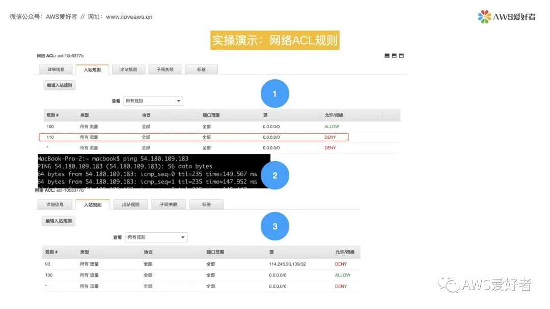 接下来的内容我们切换到AWS管理控制台,演示前面讲的内容。我们切换到EC2的控制台,当前有一台EC2在运行,我们使用这个EC2来做下面的演示。首先,看下这台EC2的安全组的入站规则,当前对所有来源开放了ICMP,以及TCP的22端口。如果我们现在要禁止一个特定的IP访问这台EC2的22端口,使用安全组是做不到的,因为前面讲了,安全组只支持配置允许的规则,这就需要配置网络ACL添加相应的拒绝规则。我们看下当前的网络ACL,进入到VPC控制台,然后安全性-网络ACL,可以看到目前我们有一个网络ACL,默认值为“是”,意味着它是创建的默认网络ACL;这个网络ACL目前关联了3个子网。您可以将网络 ACL 与多个子网关联。但是,一个子网一次只能与一个网络 ACL 关联。当您将一个网络 ACL 与一个子网关联时,将会删除之前的关联。页面下方是网络ACL的入站规则和出站规则,当前入站和出站各包括两条规则,我们看一下规则,规则左边是编号列表,第一条规则编号为100,允许了所有的流量入站;第二条规则编号为*号,规则内容为禁止所有流量入站。网络ACL是按顺序评估规则,从编号最小的规则开始,以判断是否允许流量进入或离开任何与网络 ACL 关联的子网,也就是说在网络ACL中,规则的编号越小,它的优先级就越高。假设现在有入站流量匹配到了编号100这条规则,那么网络ACL就会放行此入站流量,而不会在继续向后评估规则。也就是说网络ACL从最小编号的规则开始匹配,匹配了规则的流量就会执行该规则相应的放行或者禁止动作,而不在继续向后匹配规则。我们看下现在的默认网络ACL的规则,默认允许了与其关联的子网的所有入站和出站的流量。接下来我们就测试下,在我的本地终端是否能够访问这台EC2。
