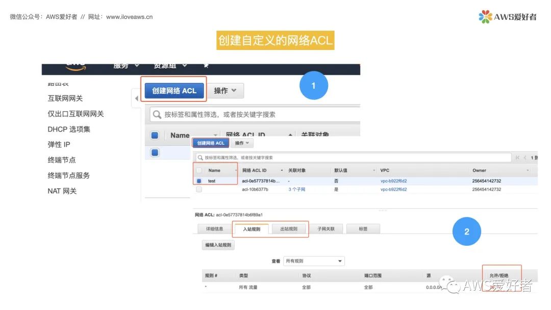 我们创建一个自定义的网络ACL,然后看下出站、入站的规则,可以看到创建的自定义的网络ACL是拒绝所有入站和出站流量的,需要根据需求自行添加相应允许规则。很多同学在实际使用网络ACL的时候都忽视了这一点,导致无法访问EC2,所以这里单独提出来讲一下。好的,以上就是我们今天的视频课程内容,希望能够帮助大家更深入的理解网络ACL。