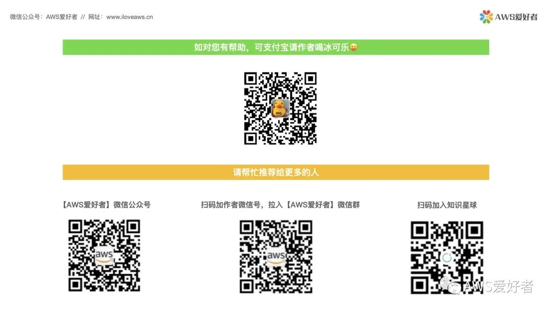 如果您想加入「AWS爱好者」微信群和其他同学交流,请:chenmoemo,后拉入「AWS爱好者」微信群。