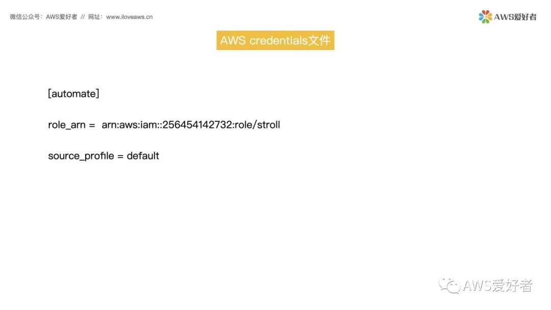 而我们现在这个用户案例,需要在本地CLI调用AssumeRole,在使用返回的临时凭证访问AWS资源,所以您需要进行配置,指定AWS CLI承担的角色,然后AWS CLI就会自动为您进行相应的AssumeRole调用,那怎么指定AWS CLI承担的角色呢?需要在aws cli的credentials文件中增加一个profile ,包括两个配置项:- role_arn,需要配置为您需要担任角色的ARN,所以我们这里需要配置成我们在上节课新建的角色stroll的ARN