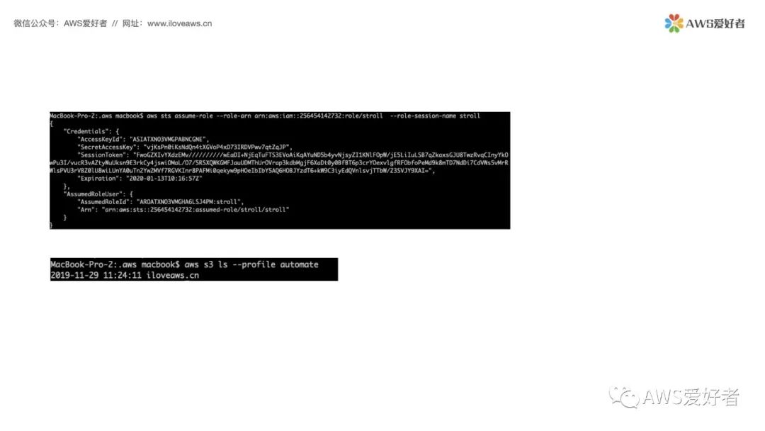 这里要注意--profile主要指定我们新创建的automate,看下命令执行结果(下图):通过配置aws cli承担角色这种方式,我们就不必在临时凭证过期时在手动执行assume-role命令获取临时凭证,在手动配置到AWS credentials文件,而这一切都将由aws自动帮您搞定。好的,以上就是我们今天的课程内容,我们介绍了配置AWS CLI承担IAM角色的步骤,希望同学们有收获。希望此系列教程能为您通过 AWS解决方案架构师认证 Professional 认证考试带来帮助,如您有任何疑问,请联系我们:- AWS爱好者的网址是www.iloveaws.cn。
