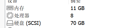 官方建议内存至少12G,我这电脑目前还有其他吃内存的再跑,就先设置11G了,从虚拟机上去看,目前是有10G内存;