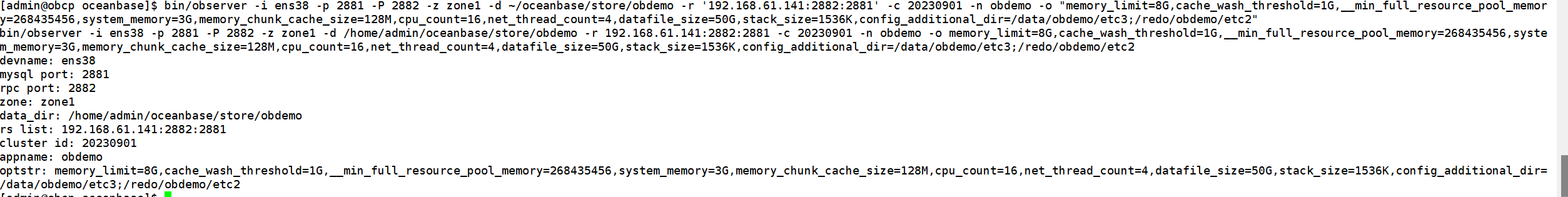 bin/observer -i ens38 -p 2881 -P 2882 -z zone1 -d ~/oceanbase/store/obdemo -r '192.168.61.141:2882:2881' -c 20230901 -n obdemo -o "memory_limit=8G,cache_wash_threshold=1G,__min_full_resource_pool_memory=268435456,system_memory=3G,memory_chunk_cache_size=128M,cpu_count=4,net_thread_count=2,datafile_size=50G,stack_size=1536K,config_additional_dir=/data/obdemo/etc3;/redo/obdemo/etc2"-i:指定网卡名-d:数据目录-p:数据库端口