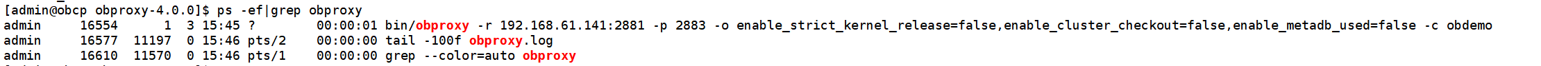 ##启动obproxy[admin@obcp bin]$ cd ~/obproxy-4.0.0/ && bin/obproxy -r "192.168.61.141:2881" -p 2883 -o "enable_strict_kernel_release=false,enable_cluster_checkout=false,enable_metadb_used=false" -c obdemo
