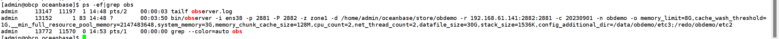 查看日志发现有个配置报错,对应调整到2G(__min_full_resource_pool_memory=2147483648)[root@obcp ~]less /home/admin/oceanbase/log/observer.log