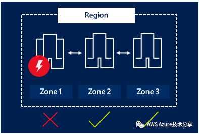 Azure 区域中的可用性区域是容错域和更新域的组合。 例如,如果在 Azure 区域的三个区域中创建三个或更多 VM,则 VM 将有效分布在三个容错域和三个更新域中。Azure 平台会识别更新域上的此分布,以确保不同区域中的 VM 不会同时更新。