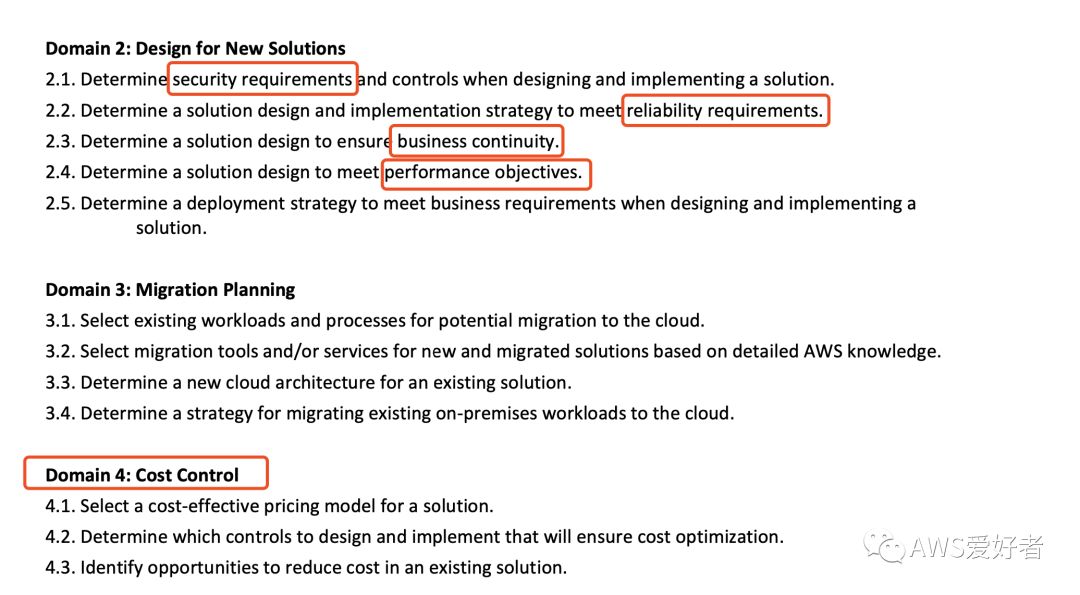 大家是否还记得Well-Architected Framework架构完善的AWS 五项支柱呢?五项支柱为:1、卓越运营,2、安全性,3、可靠性,4、性能效率,5、成本优化。对应前面的新版考试蓝图PDF内容,可以看到新版考试蓝图完全覆盖了Well-Architected Framework的知识点。
