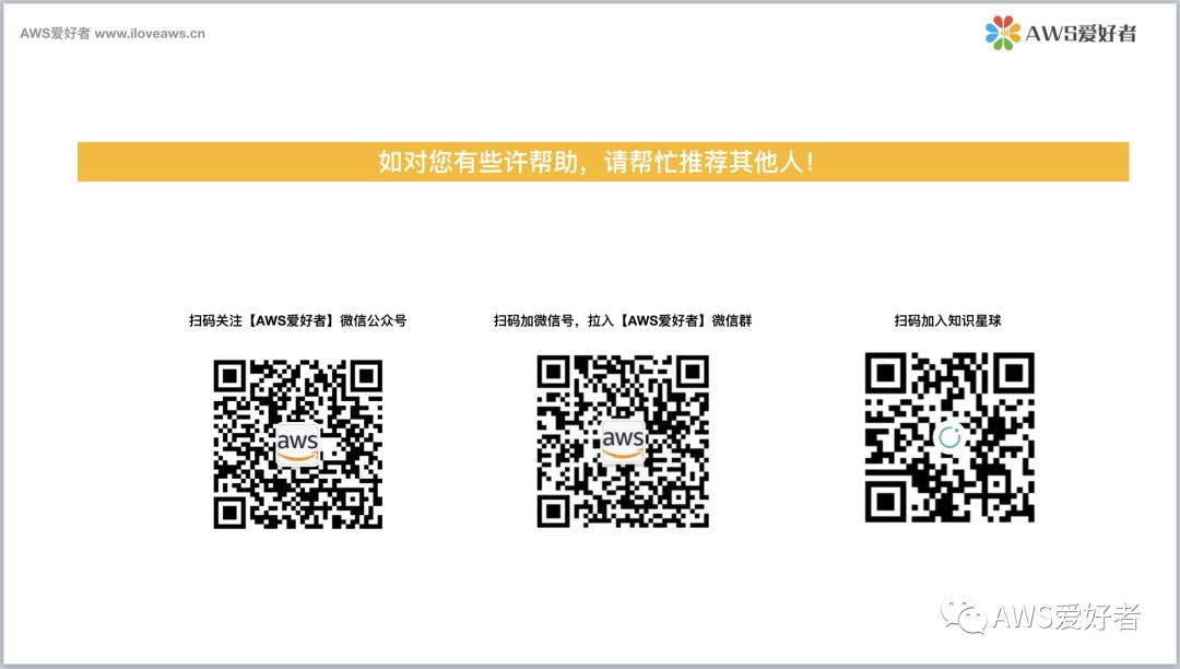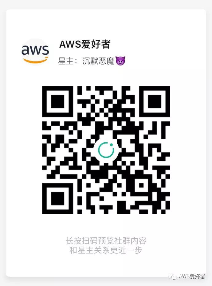 如果您想加入「AWS爱好者」微信群和其他同学交流,请:chenmoemo,后拉入「AWS爱好者」微信群。