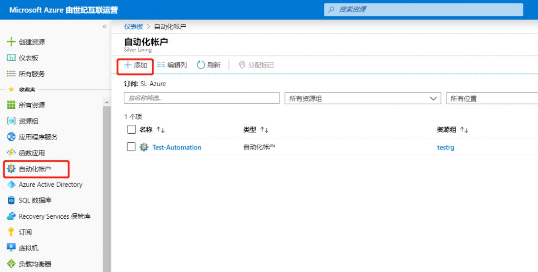 接着在自动化账户中选中 Runbook ,点击添加 Runbook :