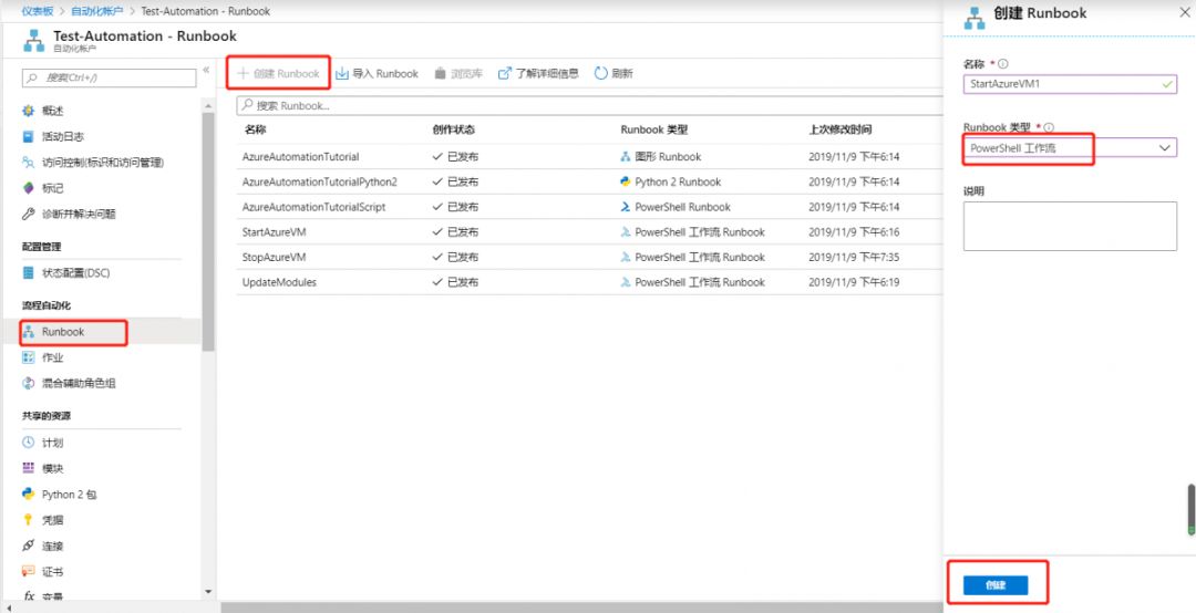 在这里我们已经创建了两个RunBook脚本:StartAzureVM和StopAzureVM。