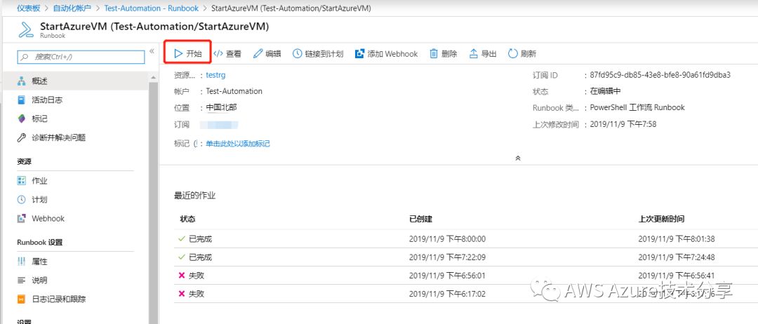 选中并进入执行的 Runbook ,可以点击 “开始”,执行这个脚本: