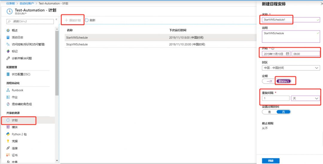 输入相关的计划信息,计划名称、开始时间,备份间隔等,我们为开机和关机时间分别设置一个:StartVMSchedule和StopVMSchedule: