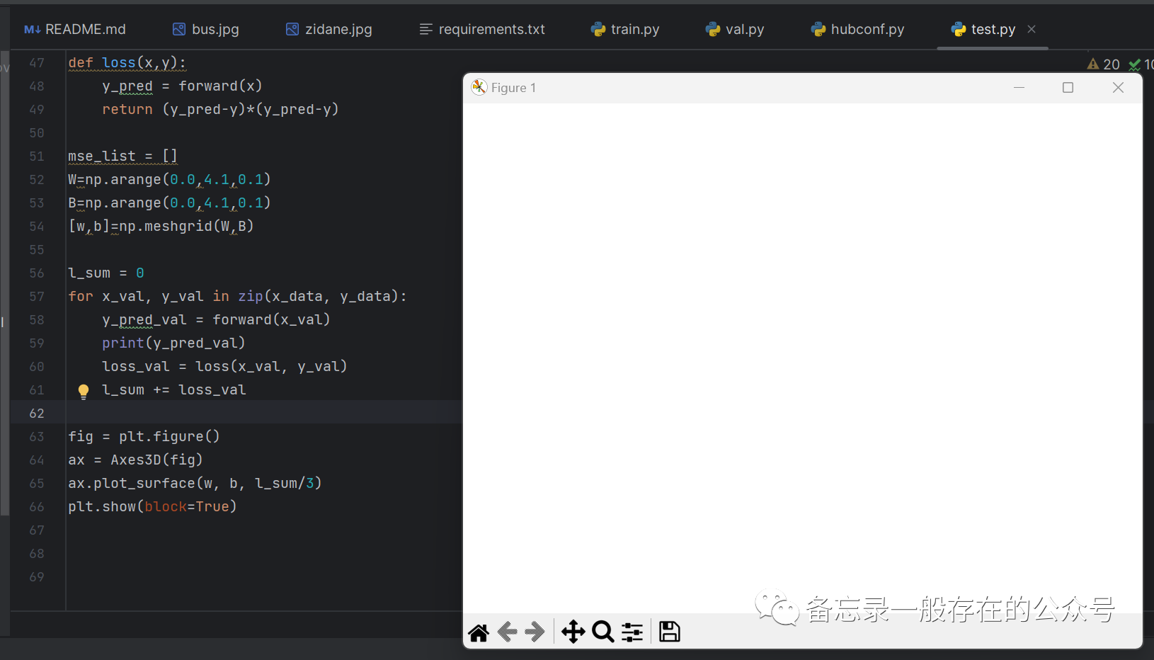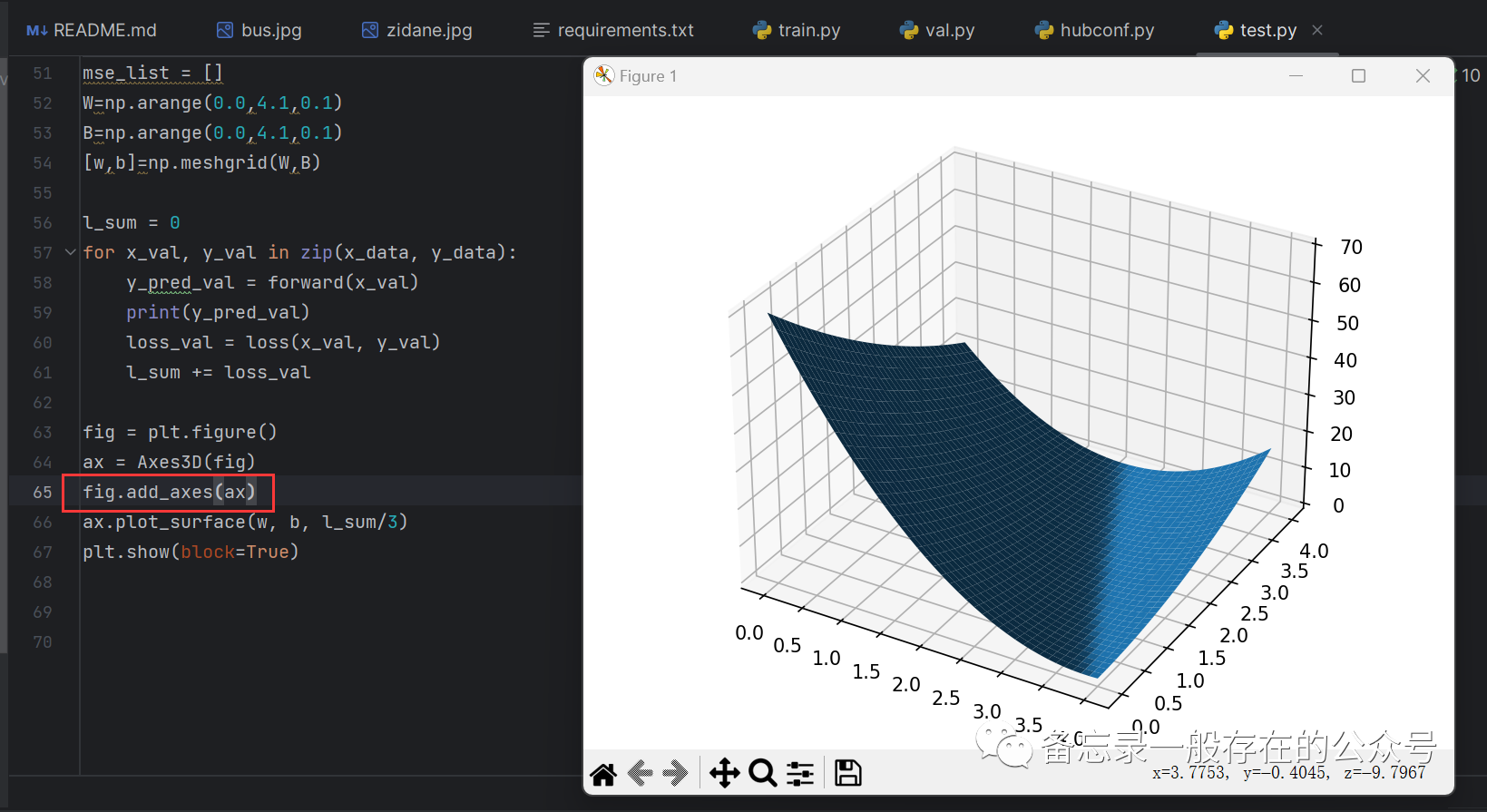 import numpy as npimport matplotlib.pyplot as pltfrom mpl_toolkits.mplot3d import Axes3D#这里设函数为y=3x+2x_data = [1.0,2.0,3.0]y_data = [5.0,8.0,11.0]def forward(x):return x * w + bdef loss(x,y):y_pred = forward(x)return (y_pred-y)*(y_pred-y)mse_list = []W=np.arange(0.0,4.1,0.1)B=np.arange(0.0,4.1,0.1)[w,b]=np.meshgrid(W,B)l_sum = 0for x_val, y_val in zip(x_data, y_data):y_pred_val = forward(x_val)print(y_pred_val)loss_val = loss(x_val, y_val)l_sum += loss_valfig = plt.figure()ax = Axes3D(fig)fig.add_axes(ax)ax.plot_surface(w, b, l_sum/3)plt.show(block=True)