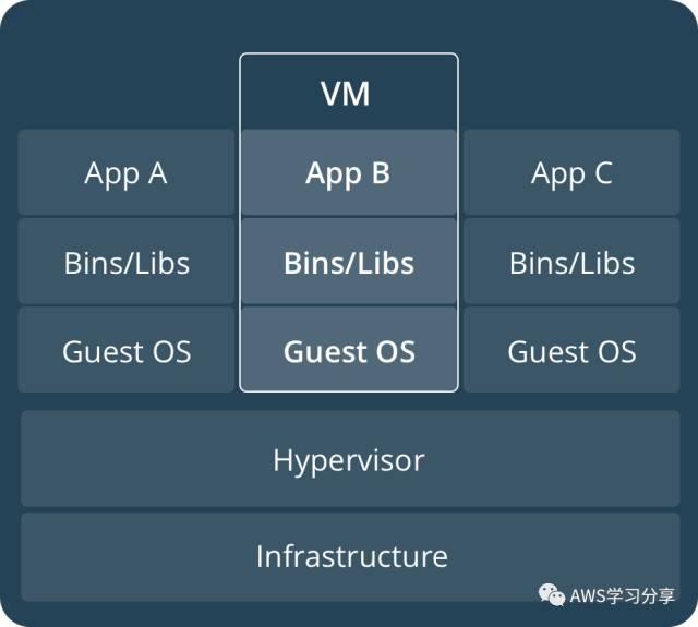 虚拟机运行客户机操作系统 - 记下每个框中的OS层。这是资源密集型,并且由此产生的磁盘映像和应用程序状态是操作系统设置,系统安装依赖关系,操作系统安全修补程序以及其他易于丢失,难以复制。
