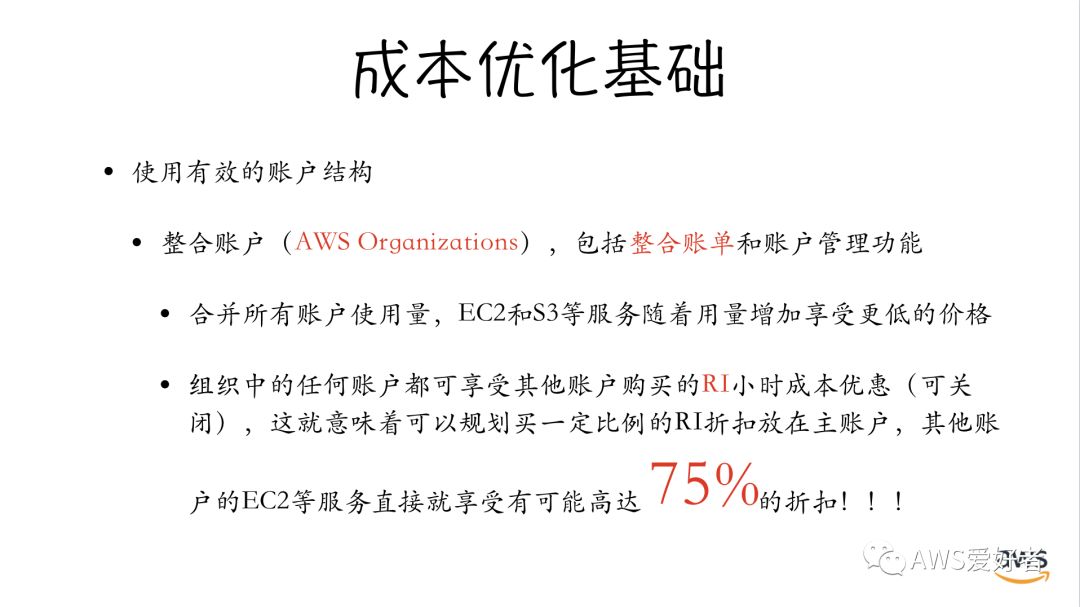 使用有效的账户结构,主要是指整合账户。整合账户这部分主要是针对企业有多个AWS账号的情况,尽早的对组织的账户规划对于成本的优化会非常有帮助。