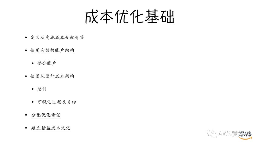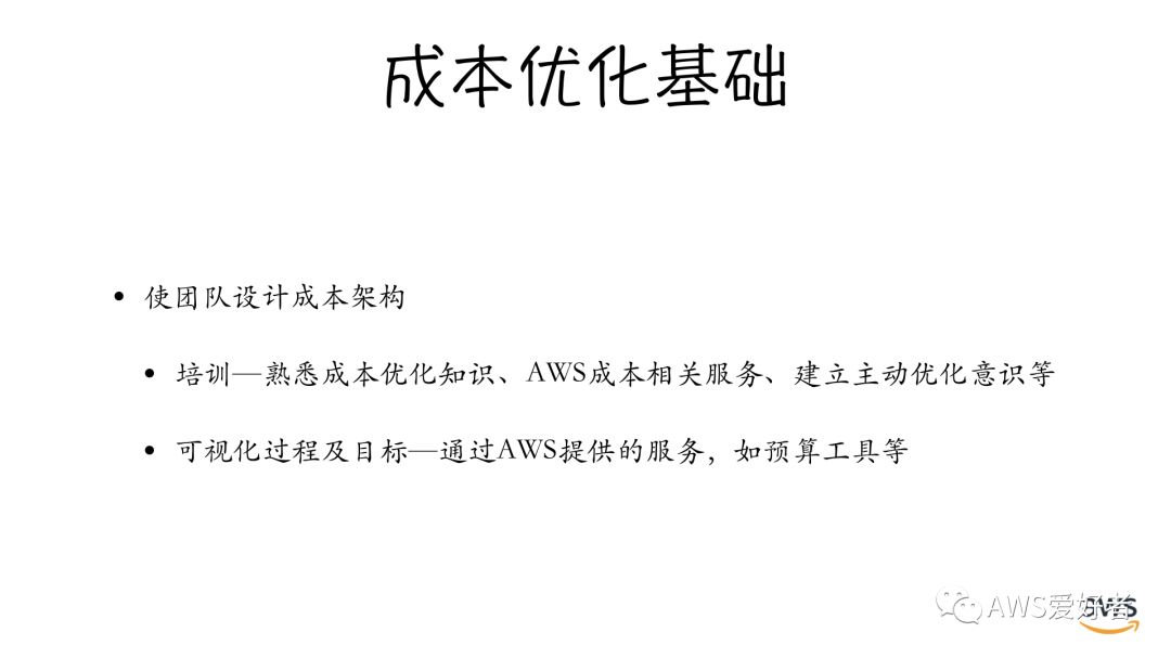 在优化成本的过程中建立可视化过程及目标,定目标,看效果,不断优化不断调整,通过AWS提供服务,如预算工具等等进行跟踪,定期评估,优化。