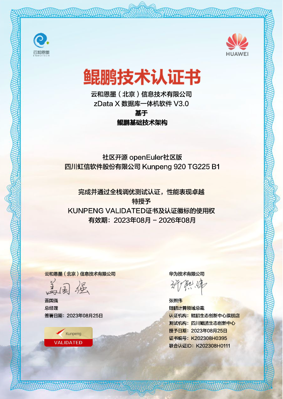 近日,经过多项严格测试评估,云和恩墨zData X数据库一体机软件V3.0(以下简称zData X),获得了鲲鹏Validated认证。