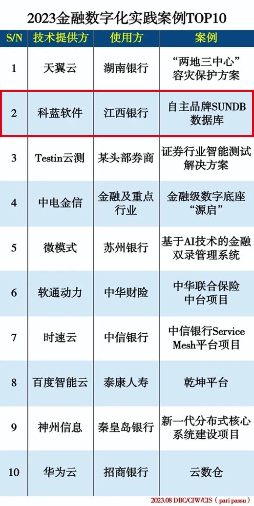由中国科学院《互联网周刊》、中国社会科学院信息化研究中心、eNet研究院、德本咨询联合发布了“2023金融数字化实践案例TOP10”榜单,科蓝软件凭借SUNDB数据库在江西银行企业网银及手机银行应用案例荣登该榜单第二名。目前,科蓝软件SUNDB数据库江西银行、江西农信、江苏农信、贵阳银行、贵阳农商、广东农信、东营银行、泸州银行、五粮液集团财务公司等金融机构上线,并在北京农商行、国泰君安证券、长江证券等进行了测试运行。科蓝软件SUNDB凭借解决了数据库的可扩展性、企业数据的实时分析和数据库的低成本迁移三个关键问题,成功获得金融业的青睐。