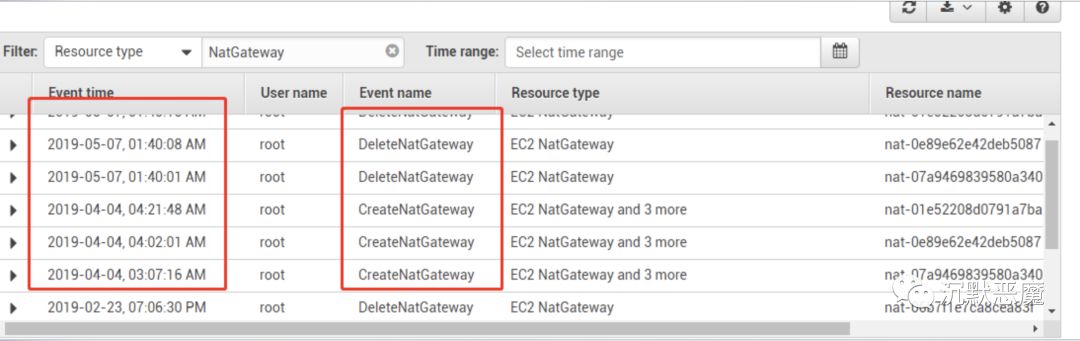 3. 1972小时,约82天,所以可判断NAT数量肯定不是一个,故引导查看了下CloudTrail,发现在4月是创建了3个NAT网关,5月份删除了,所以82天除以3月约27天,所以这部分也确认是正常的。(如图)
