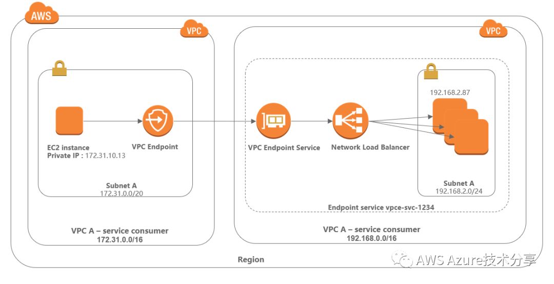• VPC_B中有一台EC2服务器(192.168.2.87),位于私有子网Subnet-A中,提供监听在内网80端口的HTTP WEB服务;前端有个NLB用来监听EC2服务器的80端口,同时,作为VPC endpointservice来进行调用。