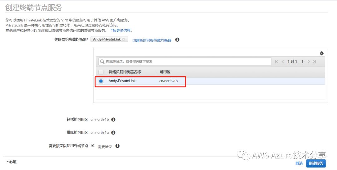 备注:此处创建的是PrivateLink,也就是终端节点服务,注意要和后面创建的终端节点区分开。