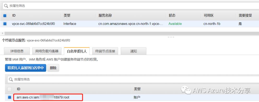 选中创建好的终端节点服务,点击下面的“白名单委托人”