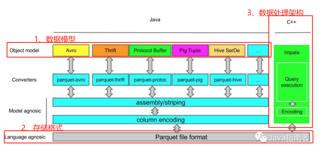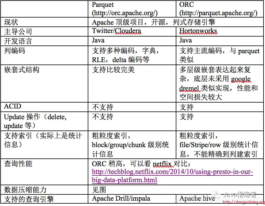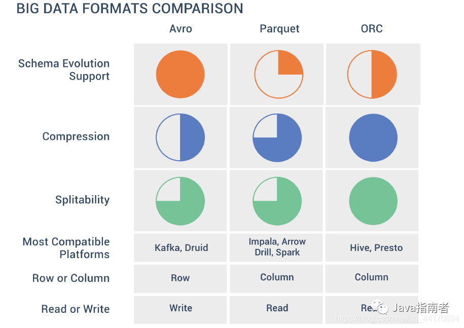 但是数据处理框架所使用的存储格式对 OLAP 很多方面起到决定性作用;如下图,如果我们选型了 impala(使用 Parquet 作为存储格式),就不能期望对模式演化(schema evolution)有很好支持;再比如,如果选型了 druid(使用作为存储格式),底层查询在存储引擎上的执行过程不能向量化执行,因此在对大数据量、少量列进行聚合计算查询时性能应该是比 impala、presto 差。