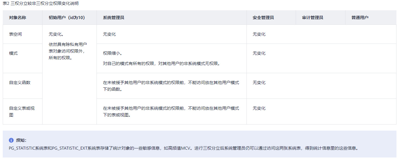 三权分立后,系统管理员将不再具有CREATEROLE属性(安全管理员)和AUDITADMIN属性(审计管理员)能力,即不再拥有创建角色和用户的权限,也不再拥有查看和维护数据库审计日志的权限。关于CREATEROLE属性和AUDITADMIN属性的更多信息请参考CREATE ROLE。
